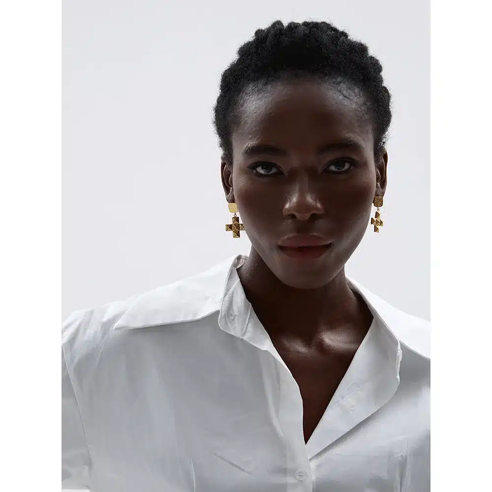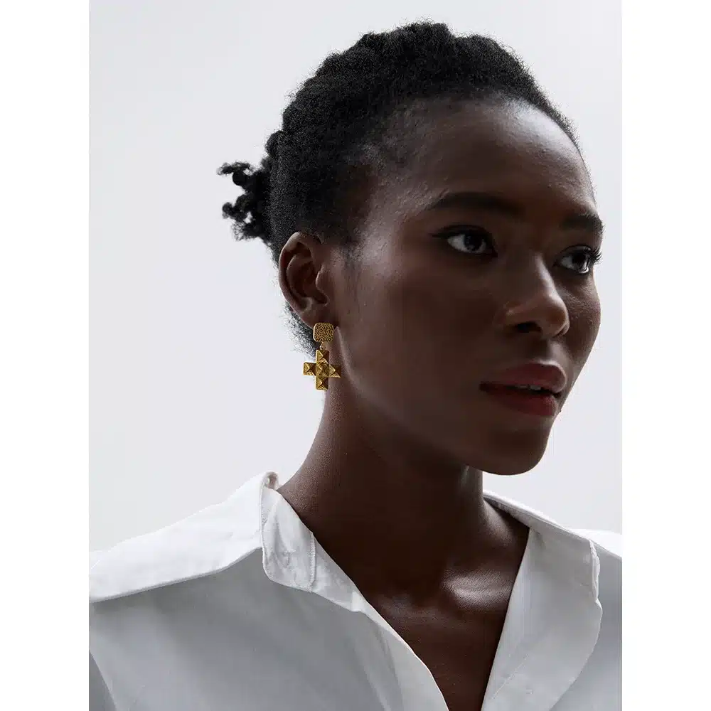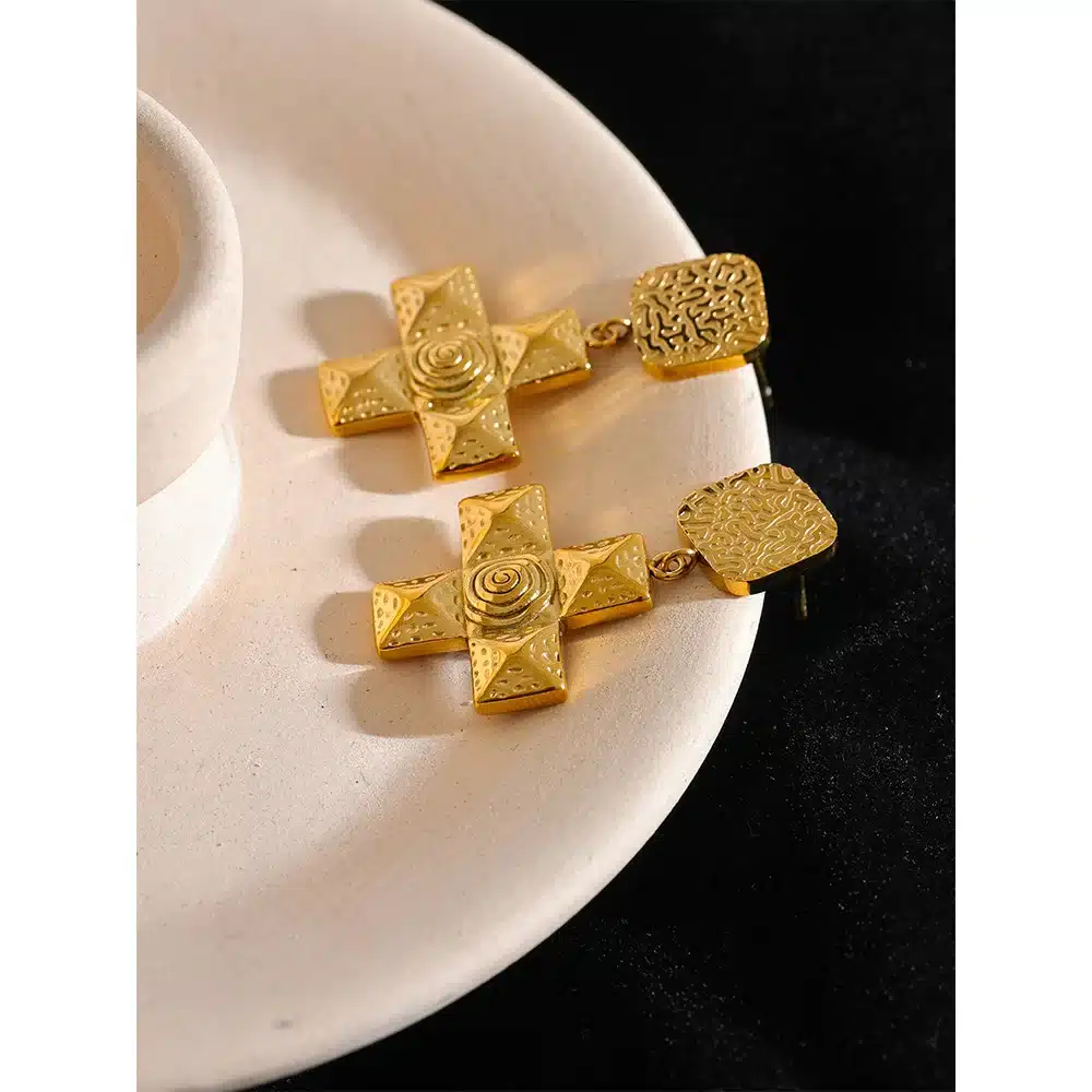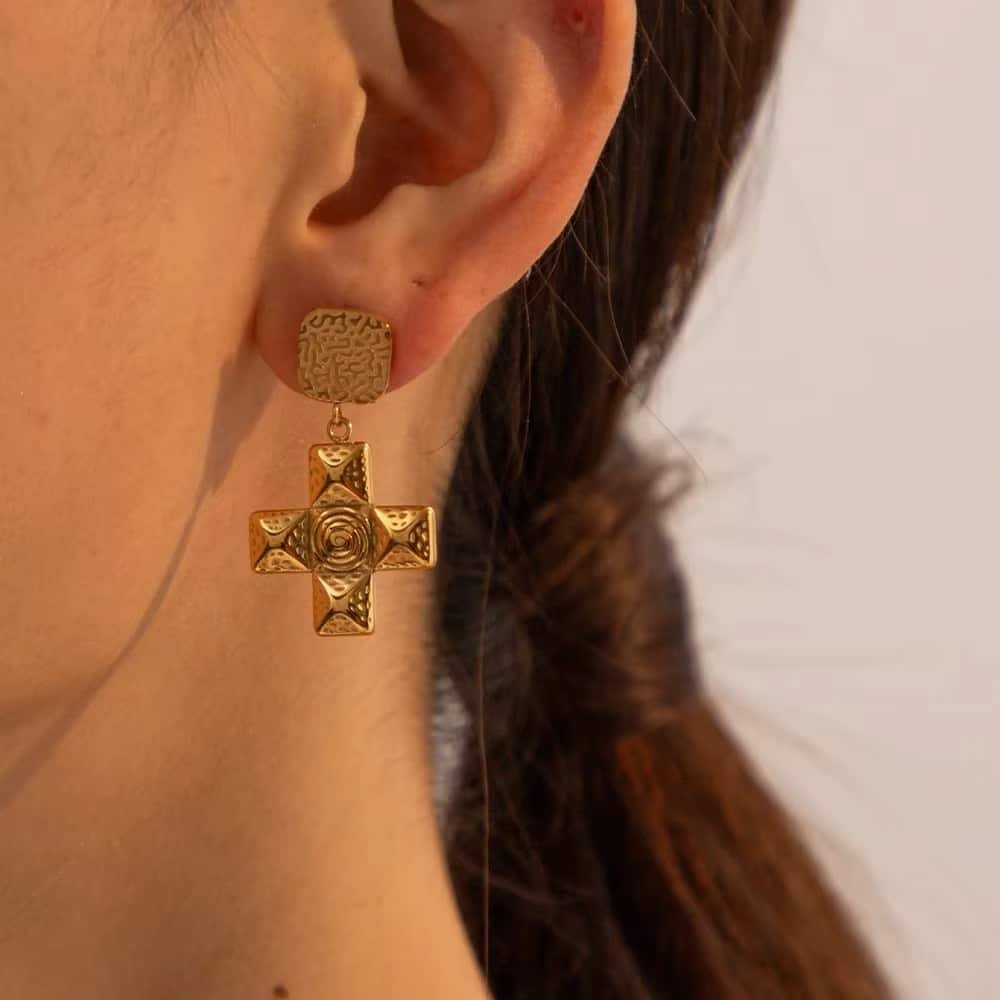 Ces boucles d’oreilles plaquées or arborent un design classique avec une croix de forme carrée pour un style à la fois intemporel et moderne.