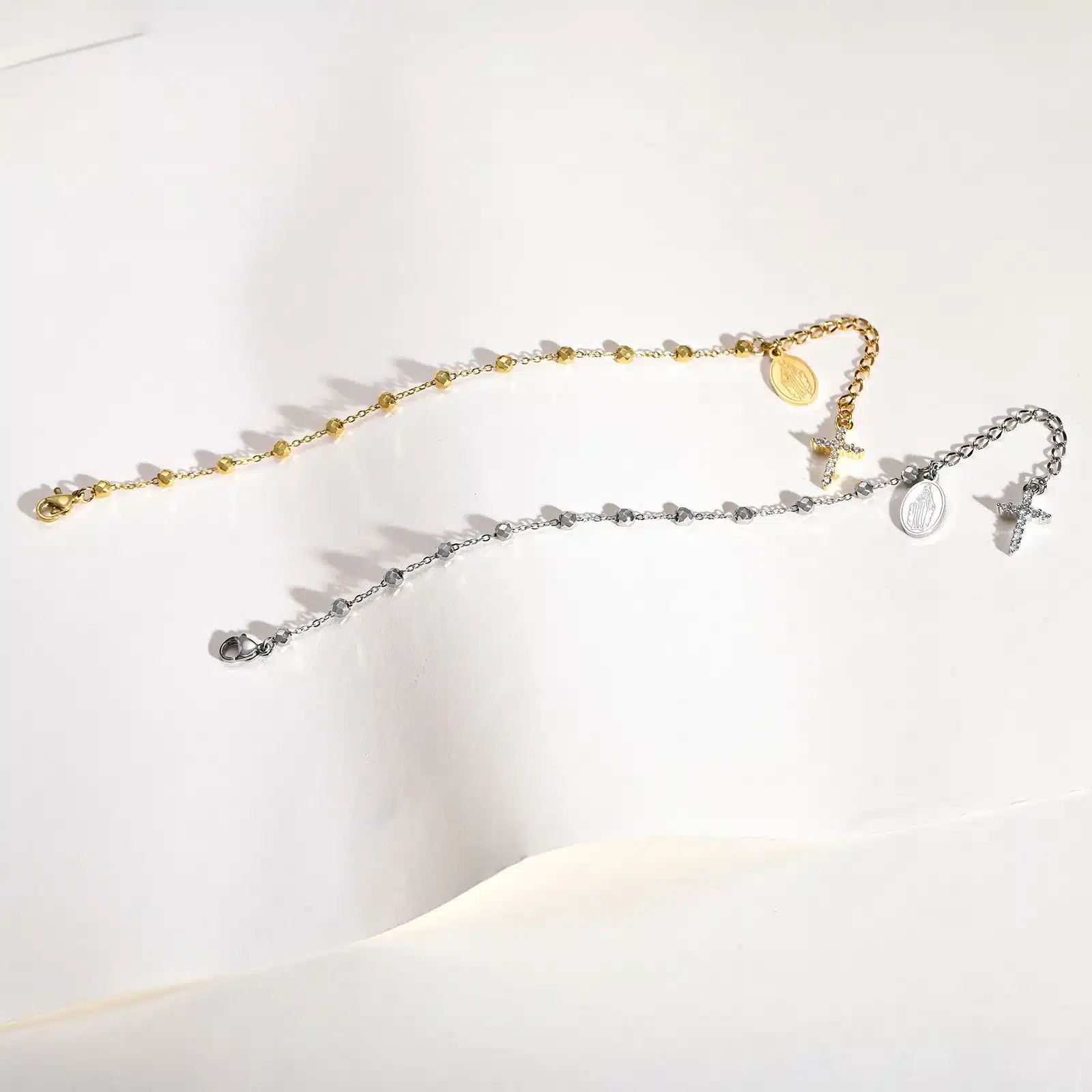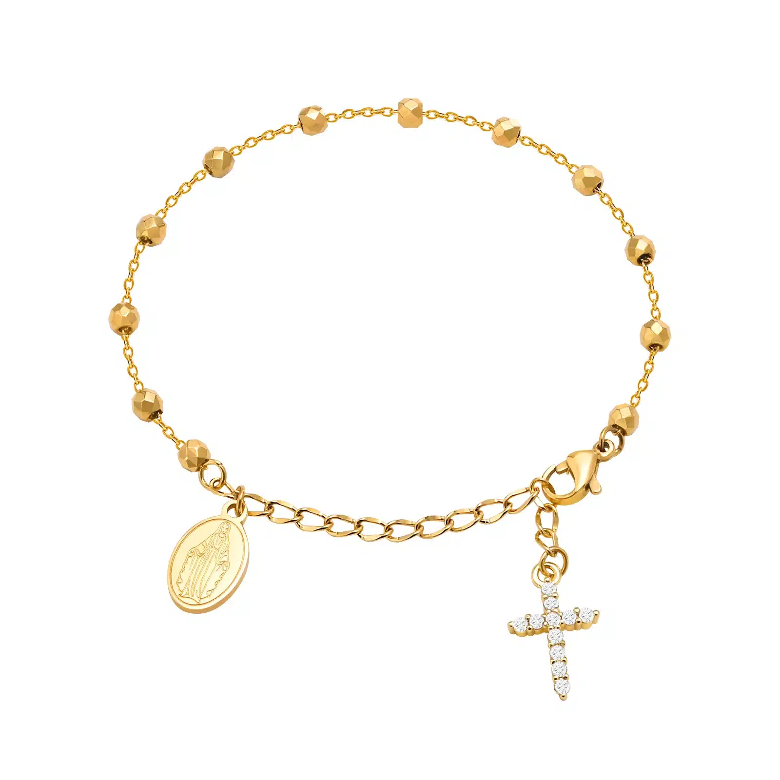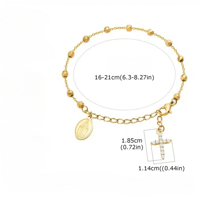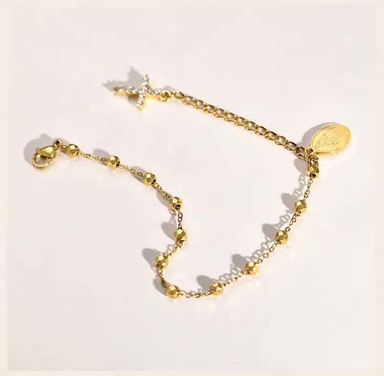 Le bracelet chapelet croisé est une fusion parfaite d’élégance et de spiritualité, composé d’une chaîne à maillons, d’une médaille de la Vierge et d’un pendentif en forme de croix chrétienne.