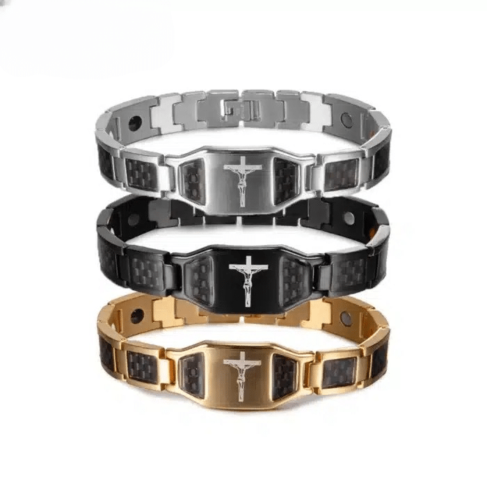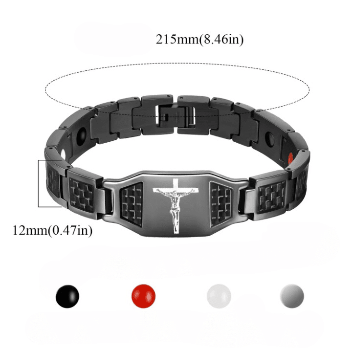 Ce bracelet magnétique Jésus combine des maillons en acier inoxydable avec des éléments en fibre de carbone.