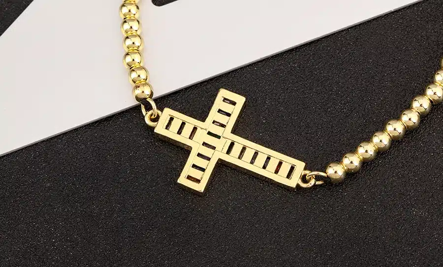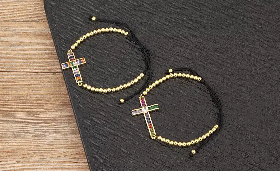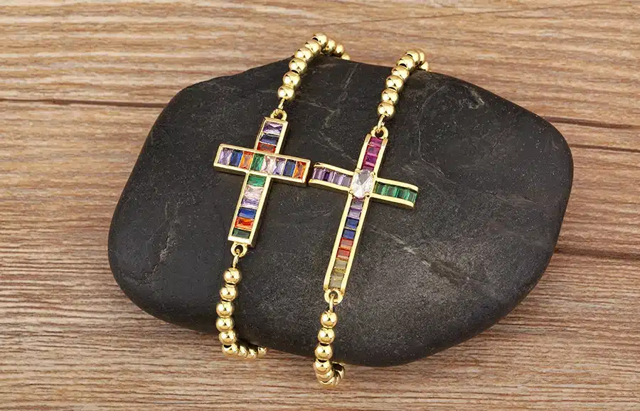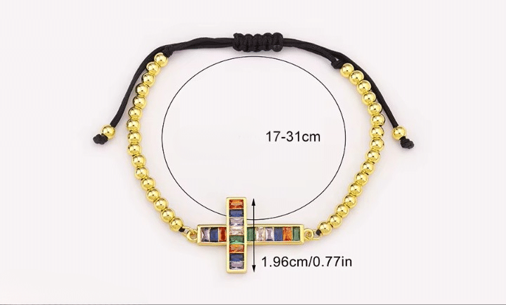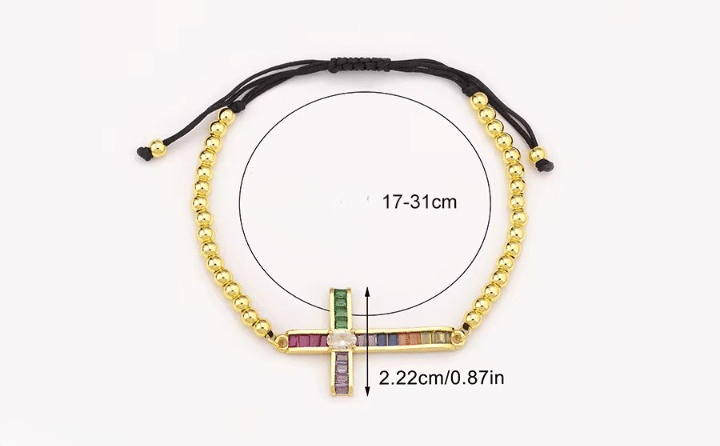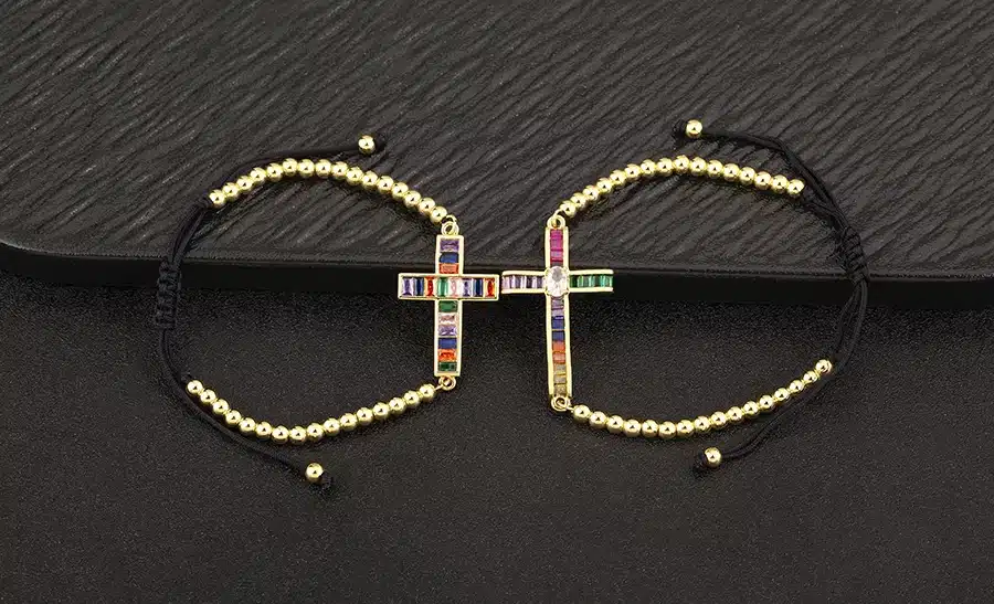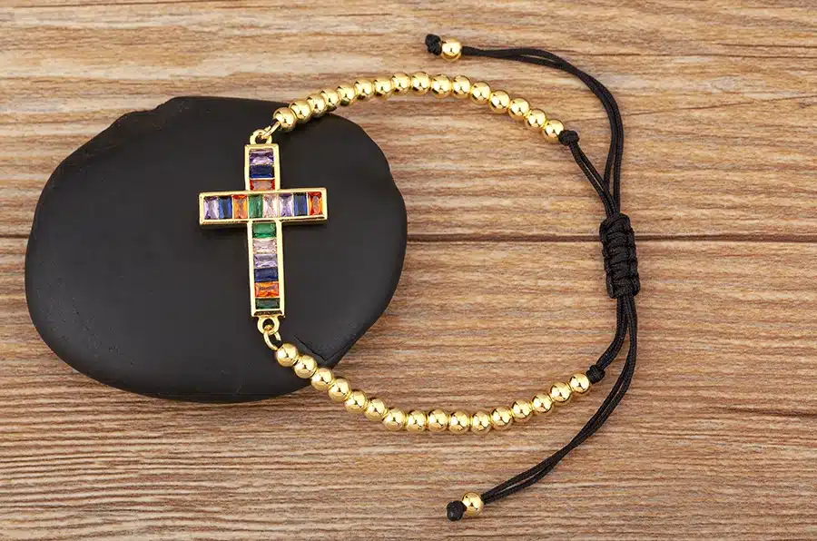 Le bracelet croix coloré est un bijou élégant composé de perles colorées et d’un pendentif en forme de croix chrétienne orné de pierres en zircon cubique.