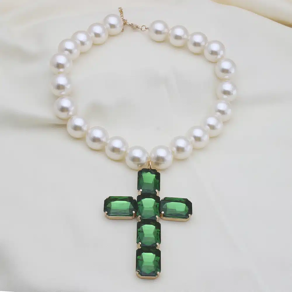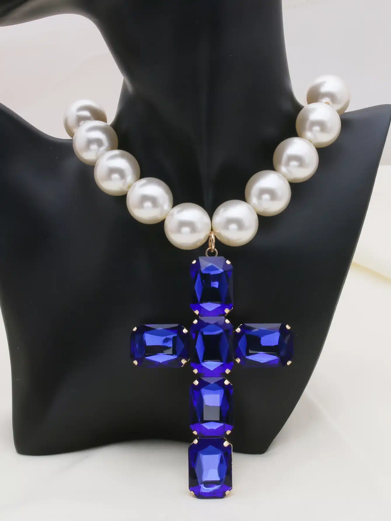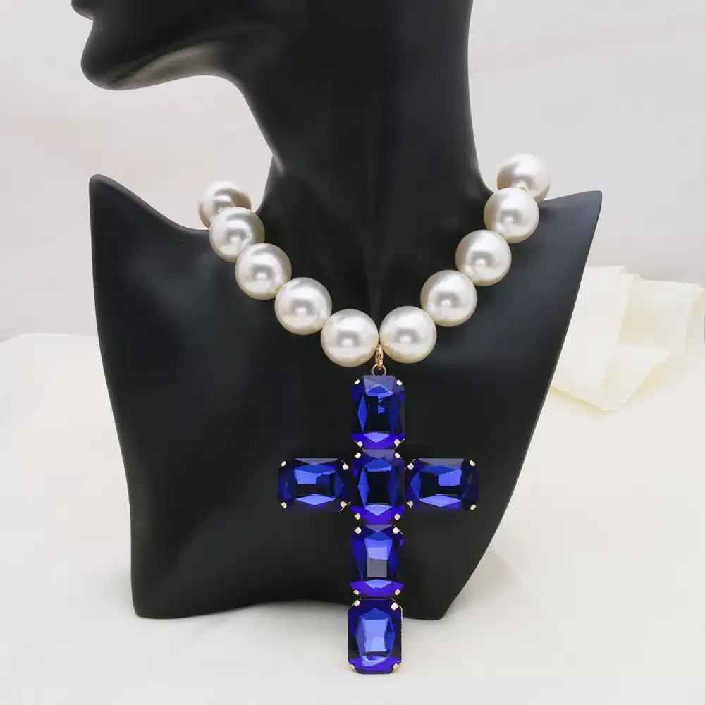 Les perles de 2 cm de diamètre créent un contraste élégant avec la croix transparente qui brille à la lumière.