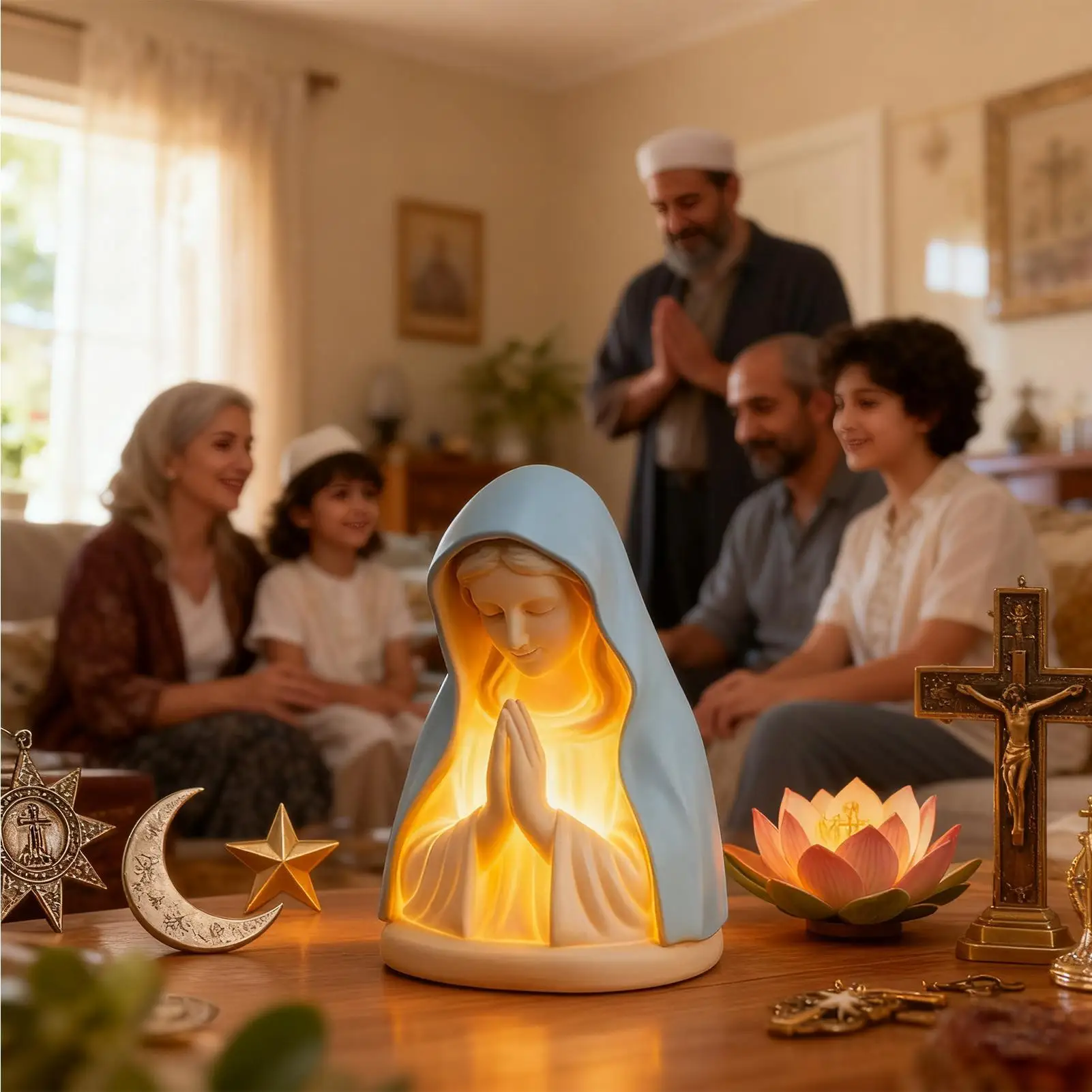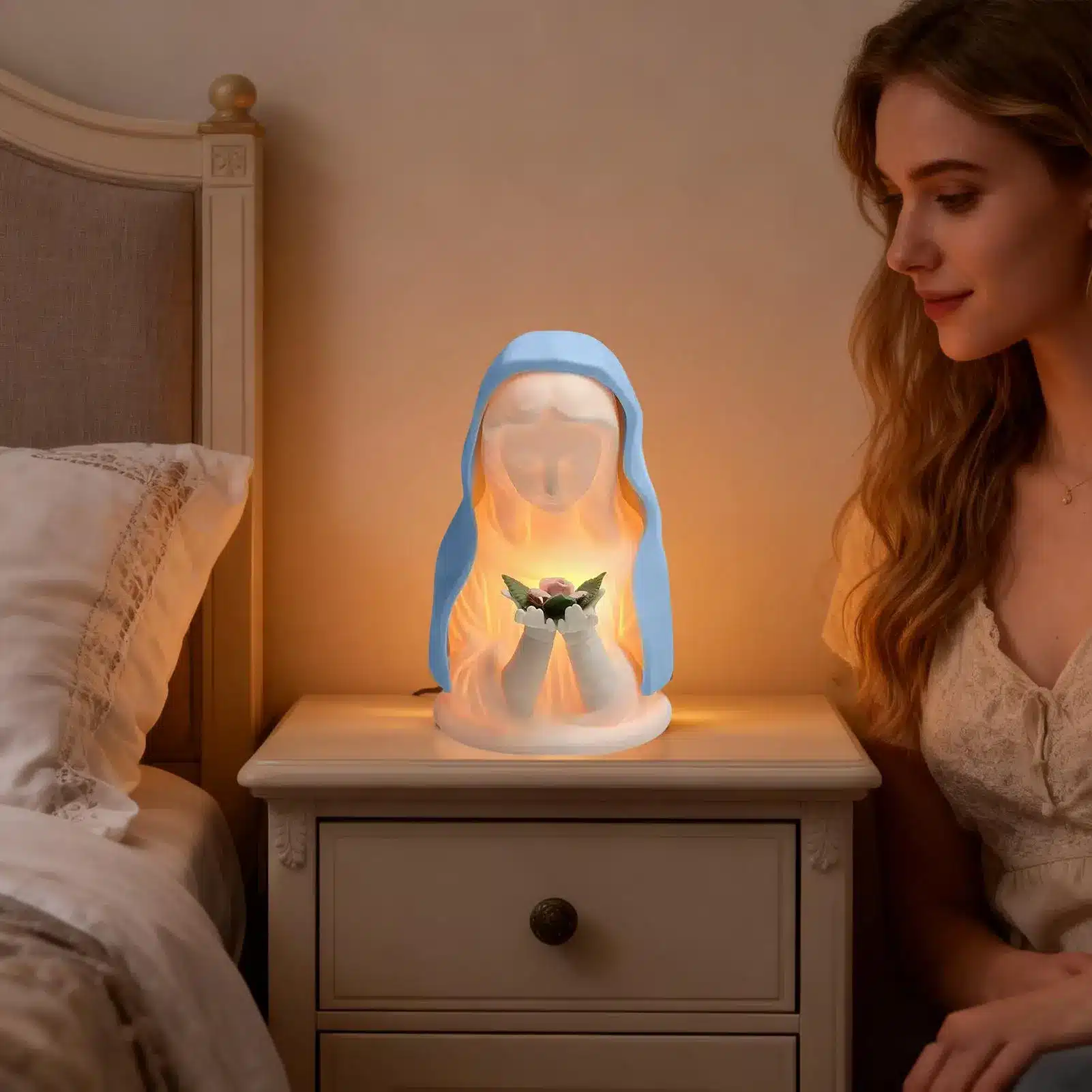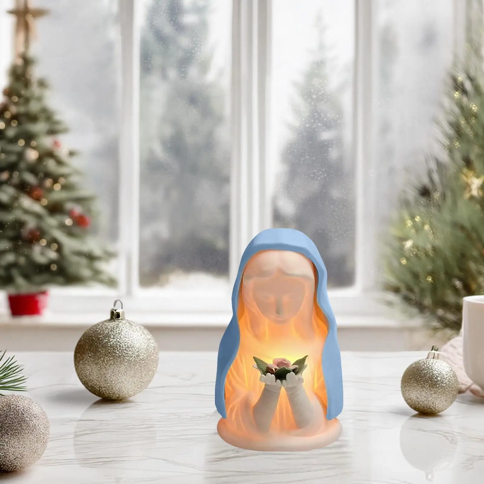 La veilleuse vierge marie diffuse une lumière douce et apaisante qui crée une ambiance chaleureuse dans votre salon, chambre ou espace de méditation.